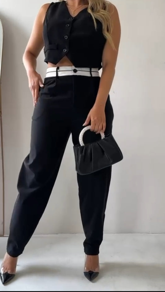 Black Bi-stretch Woven Fold Over Waist Straight Leg Pants